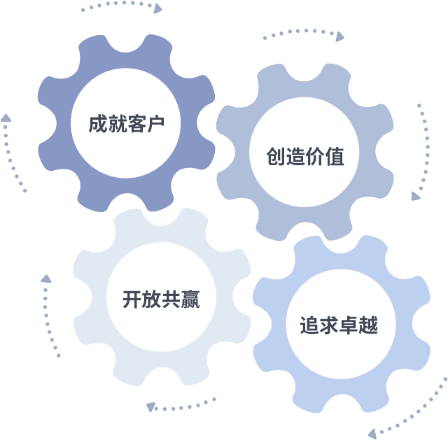 成就客户是一切决策的出发点,,,创造价值是衡量所有工作的标准,,,追求卓越是我们做事做人的态度,,,,开放共赢是我们的格局也是最终的结果。。。价值观的齿轮环环相扣,,,,推动着组织里的每个人不断向前。。