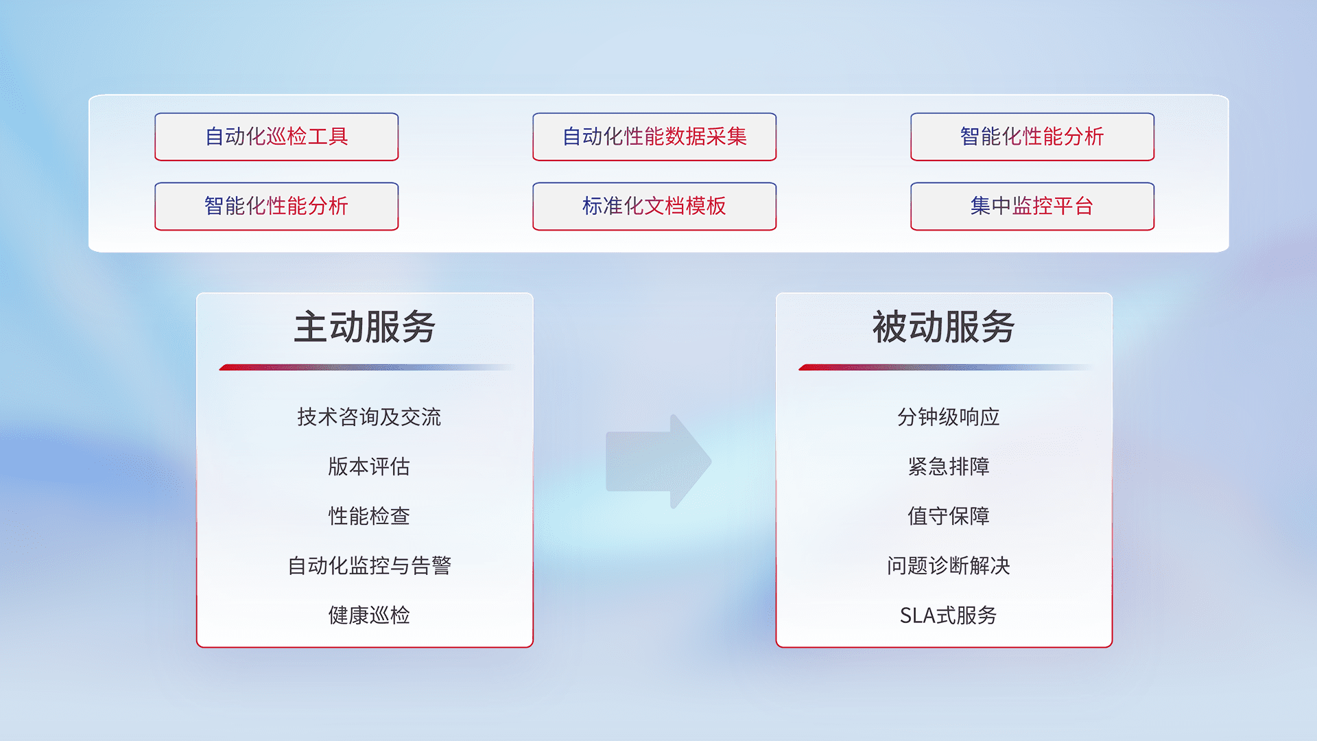 智能化工具和标准化文档,,,,保障服务质量,,提供主动服务(包含技术咨询、、、、版本评估、、、性能检查、、、、自动化监控与告警、、、健康巡检)和被动服务包含(分钟级响应、、、紧急排障、、、、值守保障、、、、问题诊断解决、、、SLA服务)。。