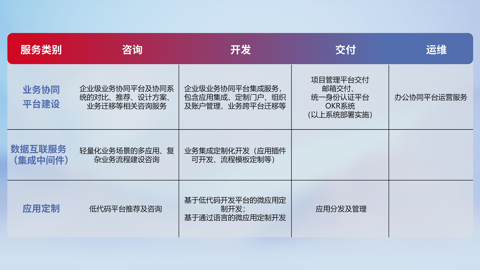 针对钉钉、、、企微、、、IDaas等平台级产品提供产品的规划、、、、方案、、交付、、、、定制化开发等服务,,实现如统一协同办公、、、、智能客户服务、、、、混合会议管理、、、智能数据查询、、等业务场景,,,,实现数字化转型。。
